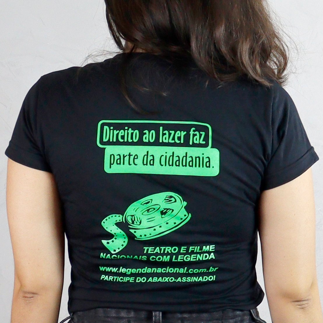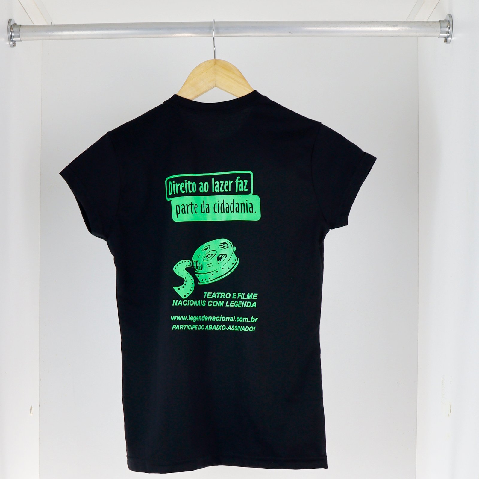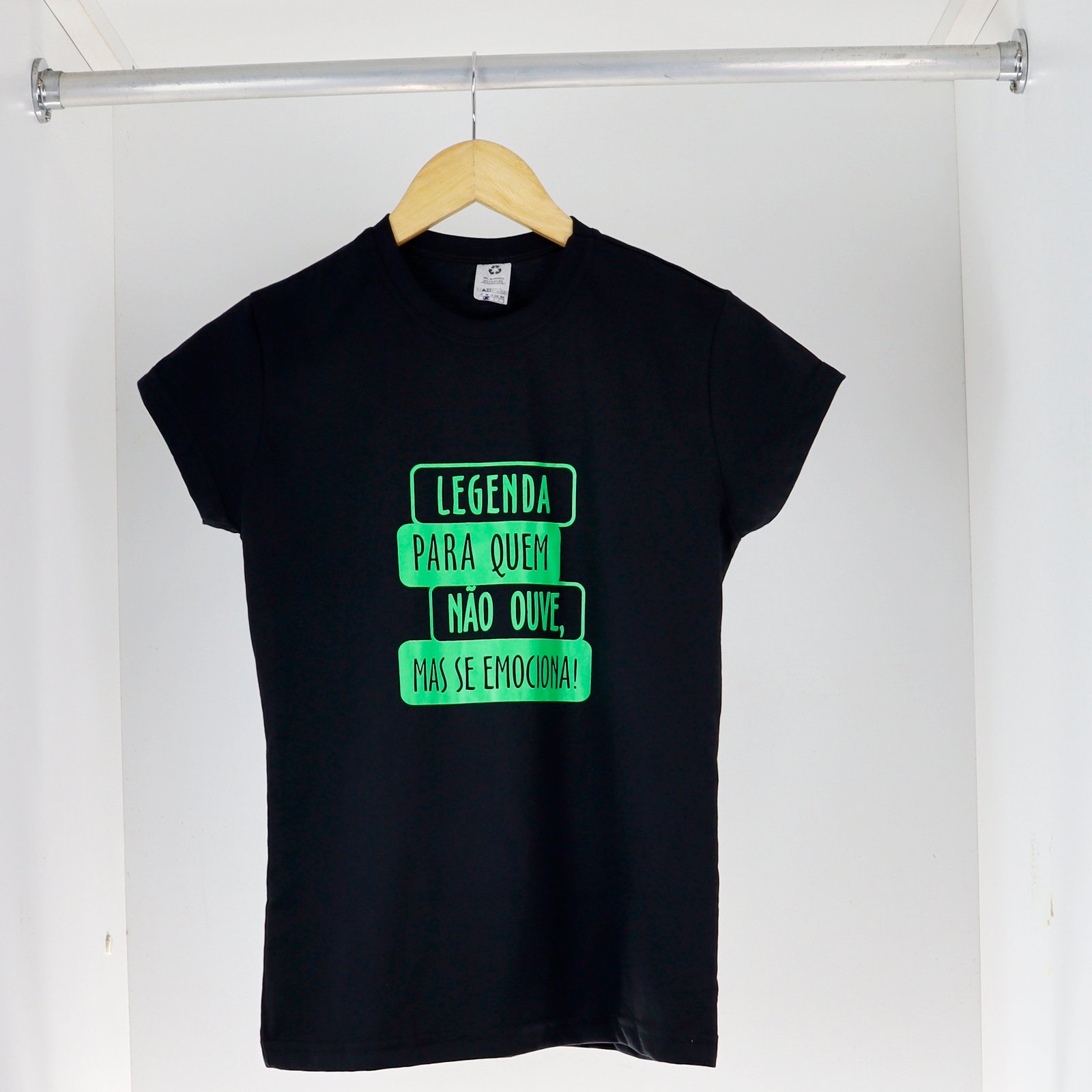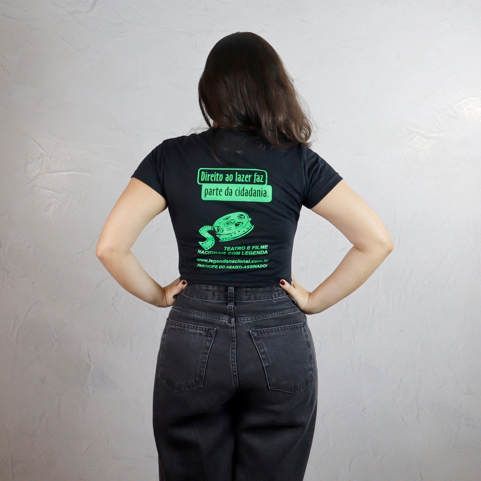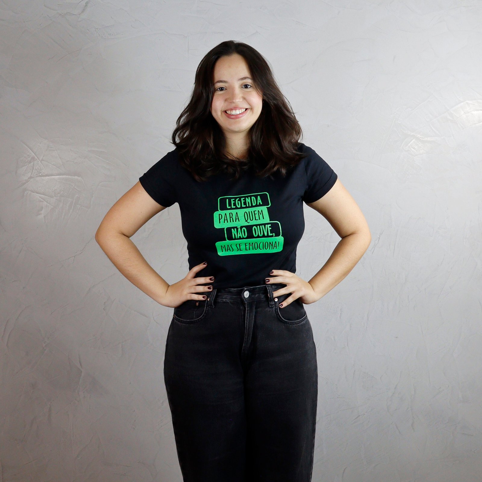 Camiseta baby preta verde flúor da Legenda Nacional é a camiseta criada para quem apoia a acessibilidade e acredita que legendas fazem diferença. Feita com tecido ecológico composto por 50% algodão e 50% poliéster PET reciclado, ela oferece conforto, durabilidade e propósito em uma só peça.