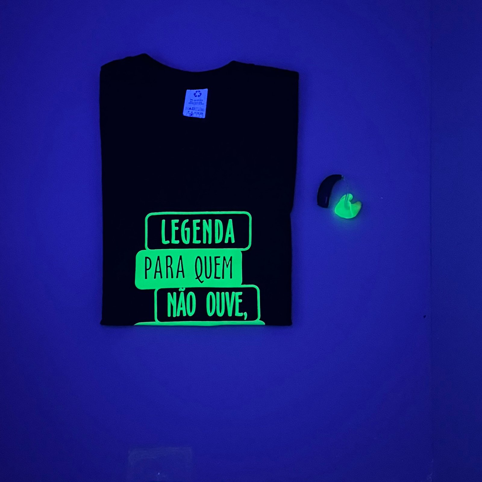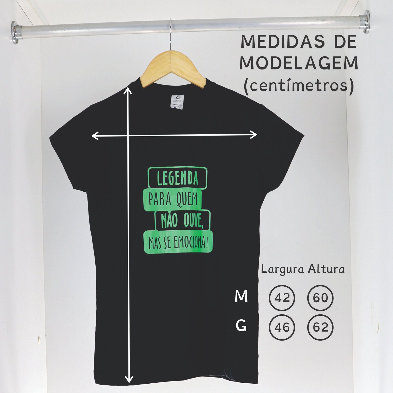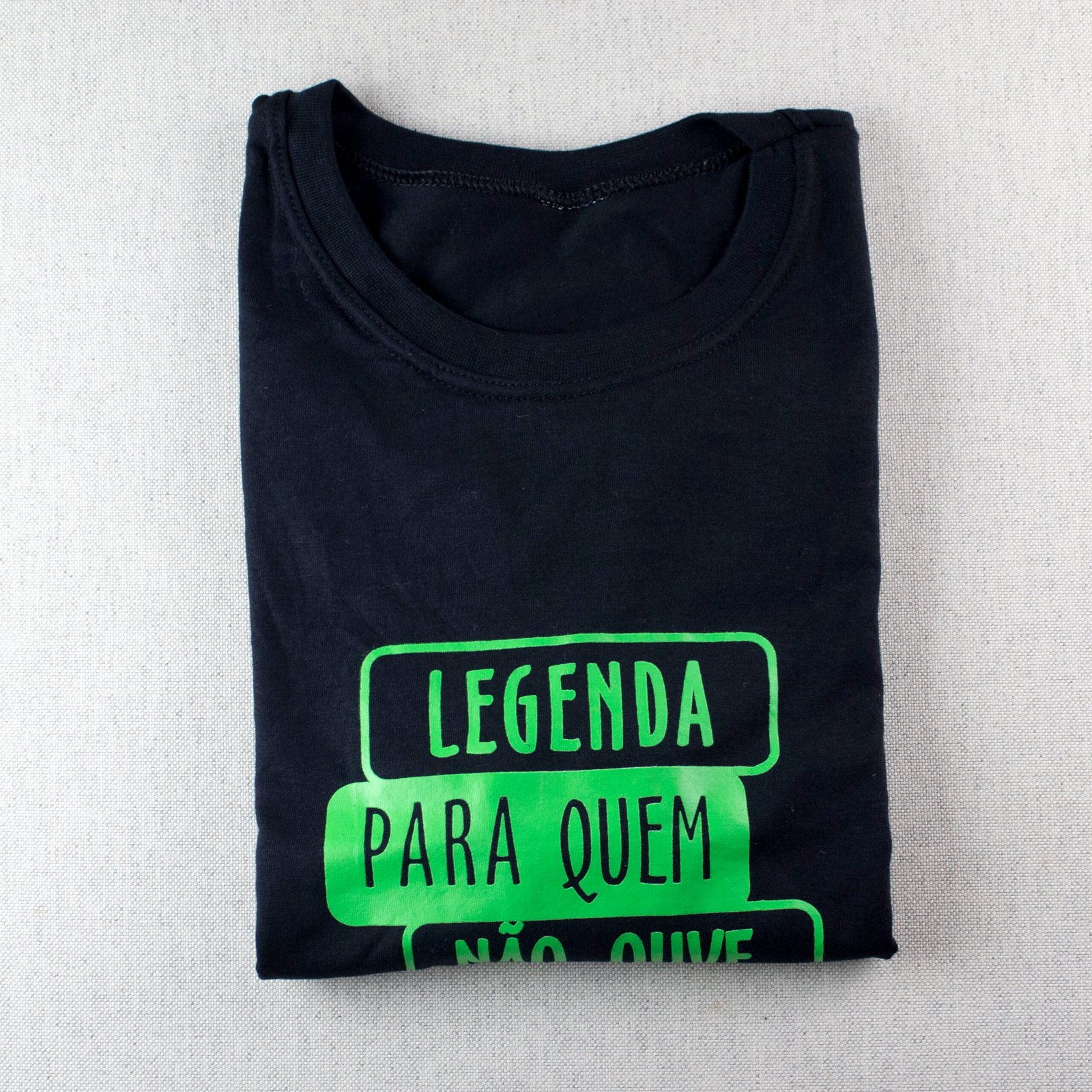 A estampa verde flúor traz a frase “Legenda para quem não ouve, mas se emociona!”, que representa a luta diária pela inclusão das pessoas surdas. Assim, ao usar esta camiseta, você comunica uma causa essencial e fortalece a campanha da Legenda Nacional.